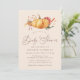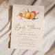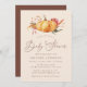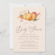 Rustikale Babydusche mit einem bemalten Kürbis, umgeben von Laub und Blume in Orange-, Braun-, Grün-, Rot- und Rosatönen. Die Babydusche im Herbstthema zeigt die in braunen Schriftzeichen mit beigefarbenem Hintergrund dargestellten Duschdetails. Auf der Rückseite der Kürbis-Babydusche befindet sich ein solider brauner Hintergrund mit Platz für zusätzlichen Text.