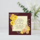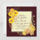 Rustikale Herbstwocheneinladung mit buttergelben, wilden Rose und Blume mit braunen Blätter auf bordeauxrotem Hintergrund.