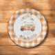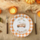 Diese zauberhafte Papiertafel bringt Ihnen alle gemütlichen Eindrücke einer Herbstfeier an Ihren Tisch. Ein klassischer karierter Büffel in Orange und Weiß umrahmt eine wunderschöne Aquarelllandschaft mit einem rustikalen Vintagen LKW, der mit Kürbissen überflutet ist. Elegante Blumenakzente und sanfte Schriftart vervollständigen das Aussehen und machen es zum perfekten Geschirr für Ihre Herbstdusche. Es ist eine bezaubernde Art, Leckereien zu servieren und die Ankunft Ihres kleinen Kürbiss stilvoll zu feiern.