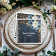 Ein elegantes Hochzeitsdesign mit eleganter Kalligrafie, ergänzt durch wunderschönes blaues Holz, grüne Saitenleuchten und weißblaue Blumen mit goldenem Glitzer. Sie können dies mit Ihren Daten personalisieren.