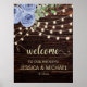 Begrüßung Begrüßungsbanner / Schild mit rustikalem Stallholzdesign mit Saitenleuchten und periwinkelblauen Aquarellblumen.