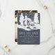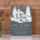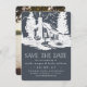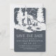 Eine Hochzeit in den Bergen planen? Erzählen Sie Ihr Datum mit unserem rustikalen Chic speichern Sie die Dattelkarten in einer rauchigen Farbpalette von knusprig weiß und ein verführerischer Schatten von dunklem Holzkohle grau, dass eine Touch von elegantem Marineblau hat. Das Design zeigt eine rustikale Landhütte im Wald, umgeben von hohen Bäumen, mit "Save the Date" und Ihren Hochzeitsdetails darunter. Die Vorlagen bieten Platz für Ihre Namen, Hochzeitstag, Ort und Hochzeitswebsite. Fügen Sie auf Wunsch ein Foto der Verlobung auf der Kartenrückseite hinzu.