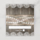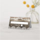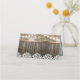 Gypsophila Land schicke Platzkarten mit einem Stallenholz Fass Hintergrund, blinkende Saitenleuchten, Baby's Atem Blume, und Ihre Initialen.