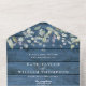 Das Ganze in einer Hochzeitseinladung mit hübschem, grünen Grün und eleganter moderner Typografie auf blauem rustikalem Holzpaneelenboden. Die Einladung enthält eine perforierte RSVP-Karte, die für Sie individuell adressiert oder links als leere Karte für die Handschrift der Adressdaten Ihres Gastes verwendet werden kann. Entwickelt von Thisisnotme©