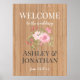 Das rustikale Hochzeitsplakat eignet sich perfekt für rustikale Hochzeitsfeiern, Empfänge und Veranstaltungen im Innen- oder Außenbereich. Das Hotel verfügt über einen Holzfußboden mit zwanglosem Blumenstrauß in Mittelpink. Personalisieren mit besonderen Tagesdetails