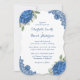 Rustikal blaue Hydrangea Hochzeitseinladungen mit blauen Hydrangea-Blume, Babyatmen und Grün auf einem schlichten, weißen Hintergrund mit blauen Blumenmotiven.