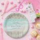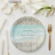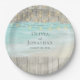 Diese rustikalen Hochzeitszettel-Teller im Küstenbereich sind mit verwittertem Holz ausgelegt, wobei im Hintergrund die Meereswellen am Strand abstürzen, und die Lichter der Saitengestelle oben hervorgehoben werden.