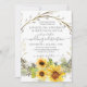 Einladung zu vertikalem 12x18 Schöner Spätsommer, Sonnenblumen von Hand in Aquarellfarben über einen Kranz im Boho-Stil mit reichlich Blätter und Muschelweiden bemalt. Rustikaler, einfacher Stil mit einem reichen, dunklen Holzboden auf der Rückseite. Art Copyright Audrey Jeanne Roberts, alle Rechte vorbehalten.