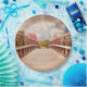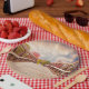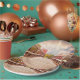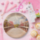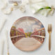 Papier Teller mit einem landschaftlichen Foto. Eine Holzbrücke führt zu einem Weg, der von farbenwechselnden Waldbäumen umgeben ist.