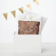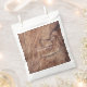 Dieses Design ist mit einem rustikalen Holzfußboden versehen. Der einfache, braune Holzhintergrund wird durch den weißen Text und das moderne, saubere mittlere kreisförmige Element ergänzt, das den Titel umgibt. Die Brauntöne des Holzkorns schaffen ein rustikales Waldgartengefühl. Elegantes Hochzeitsgunst im Taschendesign mit modernen Elementen. Auch die passenden Hochzeitseinladungen und andere Schreibwaren sind verfügbar.