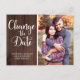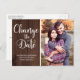 Moderne Skriptaufstellung für Hochzeiten oder Datumswechsel Postkarte mit Ihrem Foto und trendigen Schriften auf rustikalem Holzhintergrund. Wenn Sie Hilfe oder passende Artikel benötigen, kontaktieren Sie uns bitte unter cedarandstring@gmail.com