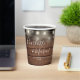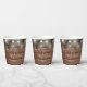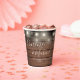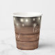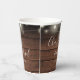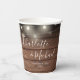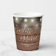 Eleganter rustikaler Hochzeitspapier-Becher personalisiert mit Signature-Stilnamen und Ihrem besonderen Hochzeitstermin auf einer Saitenleuchte und Holzpaneelhintergrund. Entwickelt von Thisisnotme©