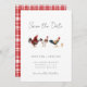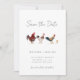Rustikale Save the Date-Karte mit Darstellung von Hühnern und Küken.