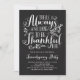 Es gibt immer etwas, wofür man dankbar sein kann. Mit dieser individuell gestaltbaren Einladung laden wir Sie zu Ihrer Veranstaltung ein. Es enthält ein Erntedank Zitat in rustikale Kalligraphie auf einem Imitat Kalkboard Hintergrund. Personalisieren Sie diese, indem Sie Ihre Daten hinzufügen. Matching-Elemente sind verfügbar.