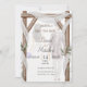 Eine elegante Hochzeitseinladung mit einem rustikalen Holzrahmen, weißen Vorhängen und einer "Bismillah"-Überschrift.