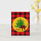 Rustikale gefaltete Grußkarten mit Kat- und Weihnachtsbaum, eigenem Familiennamen und personalisierten Unterschriften unterstrichen mit kariertem Rot- und Schwarzbüffel-Muster.
