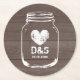 Vintage Land Chic-Maurerglas-Hochzeits-Untersetzer mit kundenspezifischem Monogramm. Rustikaler brauner hölzerner Kornplattenentwurf für tue mich Grillen, Chic-Brautparty, stilvolle Verlobung, noblen Jahrestag, Spaß bachelorette etc. Grungy Typografieentwurf. Personalisiert mit elegantem Namensmonogramm. Fügen Sie Ihre eigenen Anfangsbriefe der Braut und des Bräutigams plus Datum der Heirat hinzu. Hübscher Schablonendruck für verheiratete Paare mit verblaßtem Herzsymbol. Niedliche mit Monogramm Partysuplies und -zusätze für Probenabendessen im Freien, den Empfang, kundengerechte Hintergrundfarbe der Cocktailstunde etc. Verwitterte Shabby Chicart. Verfügbar in um und quadratische Form. WegwerfUntersetzer für Heirat-Party. Lassen Sie Ihre eigene einzigartige Scheune Dekorationen und Dekor anreden. Shabbychic Romancethema.