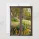 Gelbe Blumen, grünes Gras und Bäume. Schöne Natur außerhalb eines alten Fensters. Rustikales altes Weißholz auf der Rückseite. Fotografie.