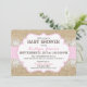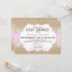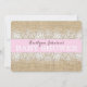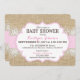 Rustikaler Babypartyeinladungs-Kartenentwurf mit rosa Kontrast und weiße Spitze über Leinwand masern Hintergrund.