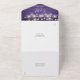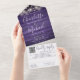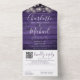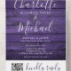 Alles in einer Hochzeitseinladung mit hübschen Saitenlichtern, prächtigen Stilnamen und schicker Typografie auf rustikalem lila Holzboden. Die Einladung enthält eine perforierte RSVP-Karte mit Ihrem Hochzeitswebsite QR Code und Details. Entwickelt von Thisisnotme©