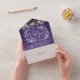 Alles in einer Hochzeitseinladung mit hübschen Saitenlichtern, handgezeichnet Blumengarten und schicker Typografie auf rustikalem lila Holzpaneelhintergrund. Die Einladung enthält eine perforierte RSVP-Karte mit Ihrem Hochzeitswebseiten QR Code und Details. Entwickelt von Thisisnotme©