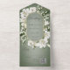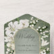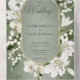 MIT ODER OHNE QR-CODE ODER ABENDESWÄHLUNGSOPTIONEN. Diese Hochzeitseinladung zeichnet sich durch ein visuell faszinierendes Design aus, beginnend mit einem dunkelgrünen Hintergrund, der einen eleganten und raffinierten Ton Set. Überlappend auf diesem Hintergrund ist ein subtiler weißer Weichzeichner, der dem Gesamtbild eine Touch von Weichheit und Tiefe verleiht. Die Einladung umschließt ein zartes goldgelbes ovales Bild, das aus weißen Lilien und Lilien der Blume des Tales besteht. Diese anmutigen Blüten sind sehr detailliert, zeigen ihre natürliche Schönheit und stellen Reinheit und neue Anfänge dar. Die Lilien und Lilien der Blume des Tals verbinden sich mit üppiger Vegetation und schaffen einen zauberhaften Rahmen, der Romantik und Charme ausstrahlt. Die Kombination aus dunkelweiss grünem Hintergrund, weißem Weichzeichner und weißem Blumenrahmen schafft eine harmonische und visuell auffällige Komposition. Dieses Hochzeitseinladungs-Design verspricht, die Aufmerksamkeit der Empfänger zu erlangen und die Eleganz und Schönheit der bevorstehenden Feier zu vermitteln. Erstellt von der einfachen Farmhouse Press.