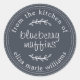 Rustikale und moderne, individuell anpassbare hausgemachte Backwaren Heidelbeermuffins Aufkleber mit dem Text aus der Küche, Heidelbeermuffine und Ihr Name in modernem Drehbuch auf einem dunkelblauen Hintergrund. Passen Sie diesen personalisierten Backgeschenkaufkleber einfach mit Ihrem Text, dem Produktnamen und Ihrem Namen an. Exklusiv für Sie entworfen von Happy Dolphin Studio. Wenn Sie Hilfe oder passende Produkte benötigen, kontaktieren Sie uns bitte unter happydolphinstudio@outlook.com.