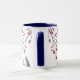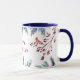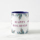 Moderne rustikale Tasse für den Winterurlaub mit trendigen Marinebäumen, aquamarinen und Jäger-grünen Kiefernbäumen, Heiligenbeeren und zwei Rotvögeln, zusammen mit "Happy Holidays" bearbeitbaren dunkelrosa Typografie-Schrift. Einfach mit Ihrem Text personalisieren +++++++++++++ Ein schönes Weihnachtsgeschenk für Familien- oder Geschäftspartner.