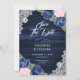 Die rustikale Hochzeit in Marineblau und Rosa bewahrt die Dattelkarte mit dem Atem des Babys und blauen und blauen Rose mit Grün auf einem Holzboden, der mit weißem Blumenmotiv dekoriert ist. Diese Kartenvorlage können Sie ganz einfach mit Ihren Hochzeitsdetails personalisieren, um eine einzigartige rustikale Blumenhochzeit zu kreieren. Speichern Sie die Datumskarte für Ihre Hochzeitsfeier in Blau und Blau.