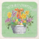 Dieser personalisierte, blumengeschmückte Ostermotiv-Untersetzer ist rustikal gestaltet und besteht aus einem weißen Korb mit gelben und lila Frühlingsblumen und Ostereiern in Gelb-, lila, Grün- und Türkistönen. Der Familienname ist in weißer Typografie auf einem Imitat mit grün verwittertem Holz gehalten. Entworfen von weltberühmten Künstler ©Tim Coffey.