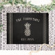 Herzlich willkommen in Ihrem Haus mit diesem charmanten rustikalen Bauernhaus Stil Türme. Personalisiertes Design zeigt Ihren Familiennamen oder landwirtschaftlichen Namen in neutraler Schrift, zusammen mit Ihrem Jahr etabliert und einer Ananas-Illustration. Die Rockleiste mit Details auf einem schwarzen Hintergrund rundet das Design ab.