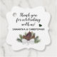 Diese schönen Gefälligkeitsmarken sind eine wunderbare Möglichkeit, um den Mitgliedern Ihres Brautparty, den besonderen Gästen oder den Familienmitgliedern zu danken. Das rustikale Design besteht aus einer Reihe von handgemalten Aquarellpinekonen und Kiefernästen, die mit einem weißen Satin-Bogen verbunden sind. Die extravagante Skriptkalligrafie lautet "Danke, dass du mit uns gefeiert hast!" mit Platz für deine Namen/Unterschrift unten. Die Rückseite ist eine tiefe Marmorwald grüne Farbe. Ideal für eine Hochzeit im Freien, im Winter oder im Urlaub.