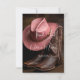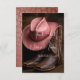 Ein wunderschön zusammengestelltes Bild, das die Essenz einer Hochzeit auf dem Lande einfängt, mit einem Paar fein detaillierter brauner Cowboystiefel, gepaart mit einem weichen Rose-Cowboy-Hut. Set vor rauer Lederkulisse; Ledertextur auf der Kartenrückseite, die Szene erinnert an Charme, Tradition und Western Eleganz - perfekt für die moderne Braut oder den Bräutigam, die ein kleines Land Flair zu ihrem großen Tag bringt.