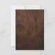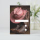 Ein wunderschön zusammengestelltes Bild, das die Essenz einer Hochzeit auf dem Lande einfängt, mit einem Paar fein detaillierter brauner Cowboystiefel, gepaart mit einem weichen Rose-Cowboy-Hut. Set vor rauer Lederkulisse; Ledertextur auf der Kartenrückseite, die Szene erinnert an Charme, Tradition und Western Eleganz - perfekt für die moderne Braut oder den Bräutigam, die ein kleines Land Flair zu ihrem großen Tag bringt.