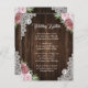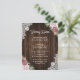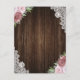 Lassen Sie Ihre Gäste von dieser rustikalen, rot-rosa blumengeschmückten Hochzeitskarte mit rot-rosa Blume auf einem mit weißer Blumenspitze geschmückten Stallholzhintergrund überraschen.