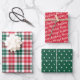 Das rustikale, moderne Geschenkverpackungs-Set bietet drei aufeinander abgestimmte Urlaubspapiere: kariertes klassisches Rot- und Waldgrün und Weiß-Uhrenmuster, Rot mit weißem Schriftzeichen "Frohe Weihnachtszeit" und Waldgrün mit kleinen weißen Kiefernmustern.