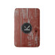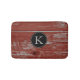 Badmatte Rot der personalisierten rustikalen Landthemascheune malte hölzernes hölzernen Hintergrundeffekt der alten Scheune. Mit personalisierter Monogramminitiale in der Mitte gegen einen schwarzen Kreis. Perfekter Baddekor für ein rustikales Blockhaus oder ursprüngliches ein Landthemabadezimmer.