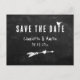 Eine maßgeschneiderte rustikale Chalkboard-Hochzeit speichert das Datum der Postkarten mit den Details der Hochzeit, Herz und Pfeil auf einem schwarzen Chalkboard-Hintergrund.