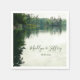 Diese rustikalen, an den Seen verwurzelten Hochzeitspapier-Cocktails bieten eine schöne, rustikale Szene unter einem bewölkten Himmel mit leicht gepralltem, aber ruhigem Wasser, das entfernte Evergreens, Zedernbäume und Felsstrukturen widerspiegelt, perfekt für ein Hochzeitsfest in Bergen, am See oder am Flussufer - von katz_d_zynes