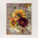 Verbringen Sie mehrere schöne Stunden damit, dieses hübsche, aber herausfordernde Puzzle zusammenzubringen. Ein großer Blumenstrauß in der Mitte ist mit zwei Sonnenblumen, einer bordeauxroten Blume, einer weißen Blume aus Elfenbein und Lilacs ausgestattet. Lilacs, Beeren und Blätter ergänzen das Design am Rande. Ein Holzkornmuster-Hintergrund verleiht ihm ein warmes rustikales Landgefühl.