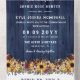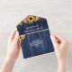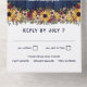 Rustikal in einer Hochzeitseinladung mit bedrucktem blauen Holzlook und Blume-Arrangements mit gelben Sonnenblumen und bordeauxfarbenen Molkereien und blütigen Blume mit Grün und Beeren Zweigen.