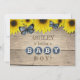 Rustikales, verwittertes Holz mit gelbem Sonnenblumenkopf oben und Akzenten auf der Rückseite. Blau-weiße Flaschenverschluss "Baby" Typografie. Für Sie erstellte Vorlagen. #zazzlemade, #rustic, #sunbluwers, #bottlecaps, #countrylife