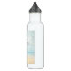 Wasserflasche mit einem schönen rustikalen Bild. Feine Farben von hellblau, sandig braun und sanft weiß. Eine Strandszene mit einem Boot am Ufer und einem verblassten Leuchtturm in der Ferne mit Vögeln, die herumfliegen. Ein eleganter, schäbiger Look.