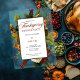 Ein ätherisches Blumenstrauß in den Farben Winterweiß, Gold, Orange und Dunkelrot mit Grün auf weißem, duskygem Gold und aquamarinem, dunklem Rand auf einem klaren Hintergrund lädt die Gäste zu einem unvergesslichen rustikalen "Erntedank Dinner" eleganten Anlass ein. Composite Design von Holiday Hearts Designs (Rechte vorbehalten).