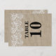 © 2013 Sozialite Designs. Unsere rustikale Jute-Tischnummer und die Lace-Look Design-Karte sind perfekt für jedes Land oder rustikale Dinner-Ambiente. Eine charmante Kombination aus Textur und femininen Designelementen für ein romantisches Ereignis. BITTE BEACHTEN SIE, DASS DER GESCHICHTE UND DER JUTE HINTERGRUND BILDER SIND, DIE AUF DIE EINLADUNG DRUCKEN UND NICHT WIRKLICH SIND. Wenn Sie Hilfe beim Anpassen benötigen oder zusätzliche Hochzeitsartikel mit diesem Design benötigen, wenden Sie sich bitte an Socialite Designs.