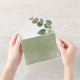 MIT ODER OHNE QR-CODE ZUM AUSSCHLIESSEN. Dieses schlichte und elegante Design besticht durch üppige Vegetation und Eukalyptus mit einem weichen, grünen Aquarell. Fügen Sie Ihrer Einladung einen QR-Code hinzu, damit Besucher schnell auf Ihre Hochzeitswebsite für Details, Anleitungen, Menüoptionen und mehr zugreifen können, oder fügen Sie Ihre Geschenkregistrierung Web-URL. Personalisierte All-In-One-Einladungen sind eine einzigartige Kombination aus einer schön gedruckten, maßgeschneiderten Einladung und einer leicht zu abreißenden perforierten UAWG-Postkarte. Und sie sind so einfach zu bedienen! Man falte einfach, dann Siegel die Rückklappe mit den drei beiliegenden Klarkleben, und Post. Und wenn Ihre Gäste Ihre persönliche Einladung erhalten, reißen sie einfach die perforierte RSVP Karte ab und lassen sie in der Mail an Sie zurück!