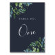 Modernes und elegantes Typografie-Design, marineblaue Tischnummer-Karte. Die Karte bietet rustikale Aquarellwaldpflanzen in Grün- und Blautönen. Bei der Bestellung von Tischnummern muss jede Karte nummeriert und einzeln bestellt werden.