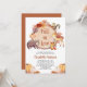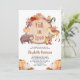 Rustikale Herbstdusche mit Baumstamm-Kranz, bestehend aus niedlichen Wasserfarben von Waldtieren (Hirsch, Eichhörnchen, Bär und Fuchs), Terrakotta-Blumen und Blattwerk und Kürbis. "Fall in der Liebe" und der Name der Mutter, die sie sein soll, sind in einem verbrannten orangefarbenen Skript geschrieben.