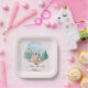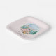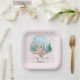 Die Teller der Papierkoordination sind ein Teil der Dekorprodukte des Party, die dieser Einladungspalette entsprechen. Weich weißer Holzboden mit Aquarellbildern aus Bergen, Wäldern und niedlichen Waldtieren mit Blume im Haar und einem staubigen rosa und grauen Zelt auf einem Glanz-, Camping-Ausflug! Der Text der Schriftzeichen-Kalligrafie endet mit dem Entwurf. Malerei von Audrey Jeanne Roberts, international lizenzierter Künstler, Urheberrecht.
