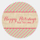 Niedliche und rustikale Weihnachtsaufkleber mit festlich rotem, grünem und weißem Streifenmuster und einem Imitat-Einbruchdesign mit dem Text Happy Holidays. Personalisieren Sie die Vorlage mit Ihrem Namen für benutzerdefinierte Geschenketiketten für Geschenke oder Backwaren.
